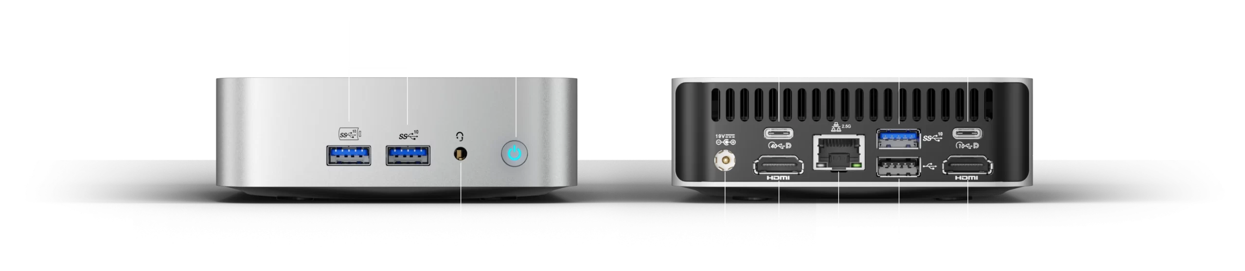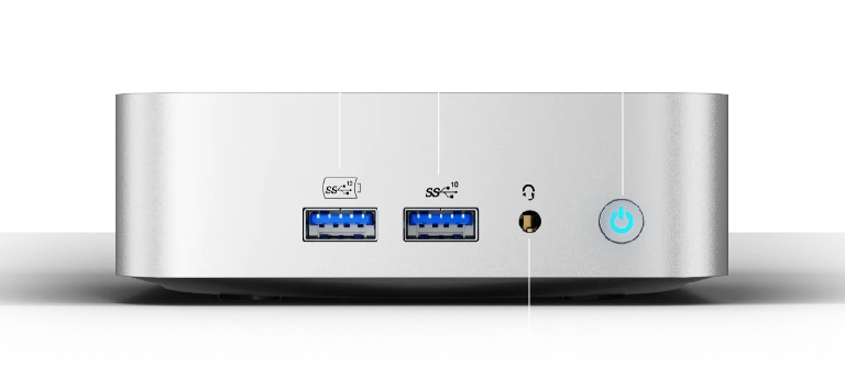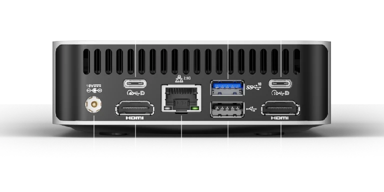 - 3 × USB 3.2 Gen 2 Type-A, 1 × USB 2.0 Type-A, 1 × USB 3.2 Gen 2 Type-C, 1 × USB 4.0 Gen 3 Type-C, 1 × 3.5 mm Stereo headphone connector, 1 × RJ45, 2 × HDMI 2.0, 1 × DC in, 1 × Power Button
