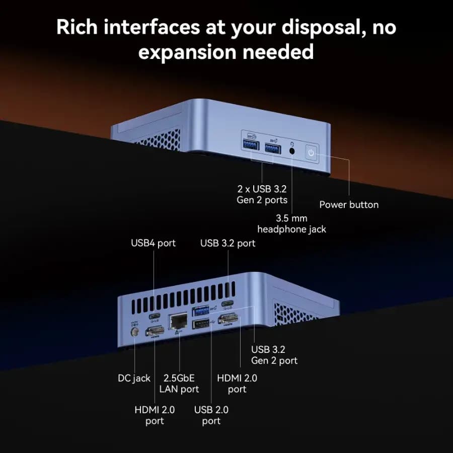 - 3 × USB 3.2 Gen 2 Type-A, 1 × USB 2.0 Type-A, 1 × USB 3.2 Gen 2 Type-C, 1 × USB 4.0 Gen 3 Type-C, 1 × 3.5 mm Stereo headphone connector, 1 × RJ45, 2 × HDMI 2.0, 1 × DC in, 1 × Power Button