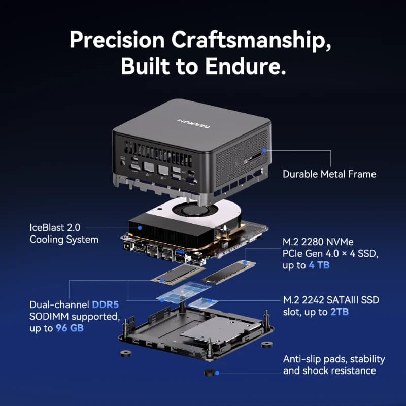 - DDR5 Performance & Triple Storage: Ditch the “soldered RAM trap.” Expand up to 64GB of high-speed DDR5 RAM and massive storage capacities via three dedicated slots: M.2 NVMe Gen4 (2280), M.2 PCIe/SATA (2242), and a 2.5″ SATA SSD/HDD bay.